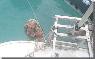 Ich pumpe unser Beiboot auf, und wir machen einen Ausflug zum Riff in der Nähe, wo wir schnorcheln und Muscheln zum Essen sammeln, d.h. Bernard findet diese (René erblickt ebenfalls eine Muschel, aber ich bleibe ohne Erfolg), und wir staunen über sein geübtes Auge, die kleinen schneckenähnlichen Dinger zu entdecken. Er versteht es auch, die Muscheln zu kochen, welche wir am nächsten Abend bei ihm kosten dürfen.